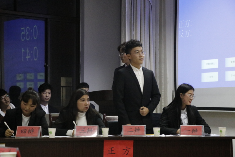 此次辩论赛辩题为“佛系”标准对青少年成长利大于弊还是弊大于利,参赛正方为数教1803代表队,反方为数本1801代表队。双方经过简短的自我介绍后,比赛正式开始。首先,双方一辩用高度概括性陈述为本场辩论赛开篇立论。正方一辩以情动人,语言具有极强的感染力;而反方一辩毫不逊色,冷静沉着、有条不紊地陈述着他们的观点。一辩辩论结束后,双方二辩的驳论也十分令人折服,表现十分精彩。