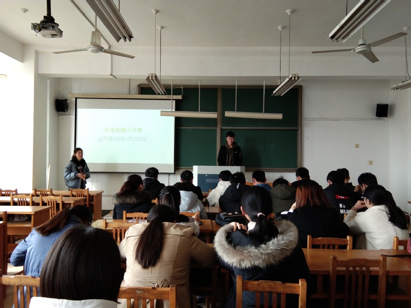 活动伊始,团支书李静介绍了此次活动的主要目的和活动流程,本次团日活动章程为社会实践的意义、报告分析、报告格式要求、实践分享和活动总结。李静首先介绍了本次社会实践的目的和意义,她认为社会实践可以提高自己的实践能力、交际能力、思考能力。通过亲身体验社会实践,能让自己更进一步了解社会,在实践中增长见识锻炼自己的才干,检验自己所学和能力能否为社会所用,并找出自己的不足和差距。接着,李静展示了班级社会实践的主题类型和报告格式的分析,并就社会实践报告类型分析向同学们提出几点要求。通过分析让我们了解到本班同学大部分以“入基层,观百态”社会活动和“走百县,访千企”就业实践活动为主,而少部分同学选择“暖冬关,关爱”志愿服务活动和“挑战,青春”创新科技活动。对实践报告格式分析,是希望我们在以后的报告中态度要端正,格式要正确标准。随后,班级同学分享自己在这次社会实践中的小故事,其中“走百县,访千企”就业实践活动的一些主题分享对同学们的就业观有很大触动。最后班长朱帅康进行总结,他表示大学生可以通过社会实践更快地融入现在的社会,这样有利于同学们的就业。朱帅康希望同学们认真的对待每一次社会实践,这对个人的成长有着巨大的帮助。