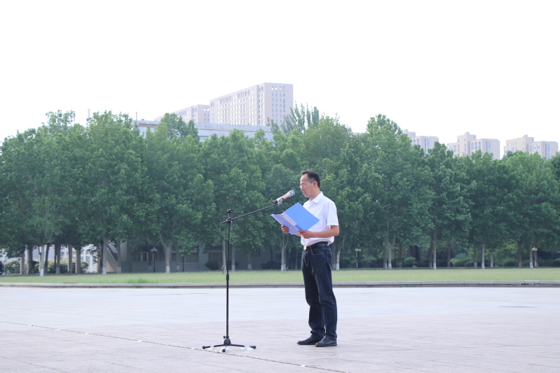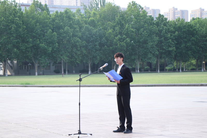 演讲结束后,青年学生代表石鹏宇带领全体同学宣誓。最后,王超老师进行国旗下发言。他表示国旗代表着国家事业的发展,时刻提醒着我们不能忘却身份,要铭记历史,珍惜来之不易的幸福生活。他提到,近年来学院不断深化教学改革,加强学风建设,着力推进“五有人才”培养,目前已取得很好的成绩。他勉励学生们一定要牢记习近平总书记的谆谆教诲,坚定理想信念,勇于创新创造。秉着“厚德、博学、笃行、至善”的校训做一名新时代的杰出青年。