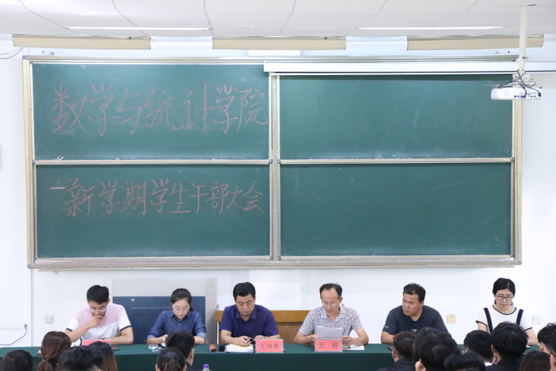8月29日下午,数学与统计学院在15号教学楼103教室举行“数学与统计2019年下半年新学期学生干部会议”。学院党总支副书记王仲孝,学院团总支书记、学工办主任王超、学工办辅导员加尼别克、刘曌阳、刘洁,各班班长、团支书和学生会部长以上成员参加,张丽姣主持此次会议。