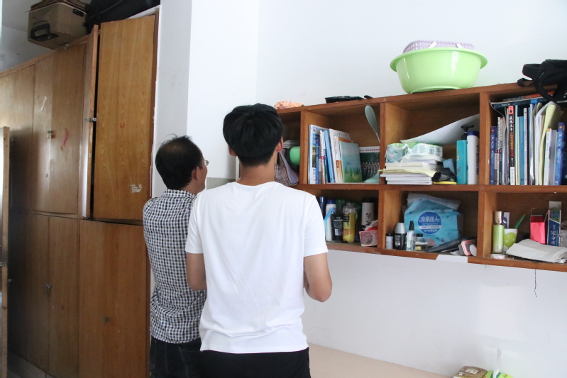 检查人员一行首先来到18号男生宿舍楼,并严格按照评分标准进行检查打分。每进到一间宿舍,王超都会仔细查看,并当场指出不足。他和学生一起整理了书柜,并告诉同学们书柜是最不应该出现不整齐的地方,学生首要任务就是学习,首先要将自己学习上的事情处理好才能将自己其他的工作处理好。他还以老师工作为例,老师的工作也要时刻保持着整齐有序,这样工作起来才会更有效率。针对其他物品摆放不符合规定的,王超也一一提出要求。