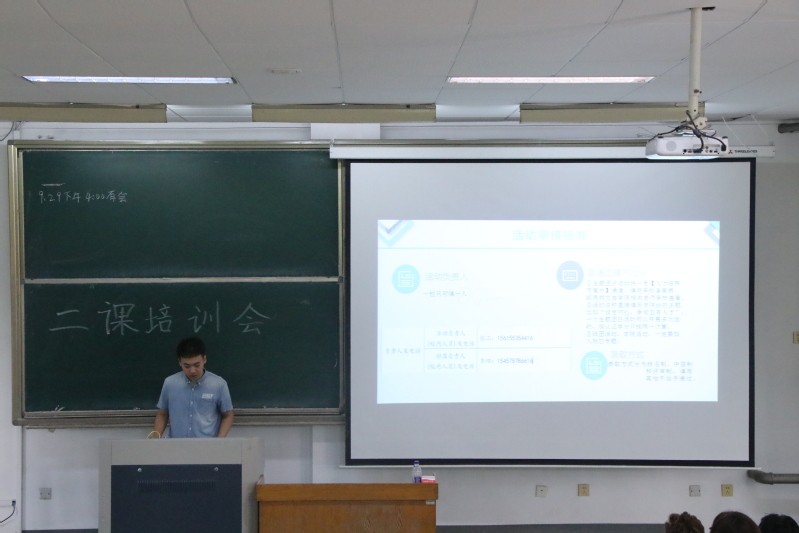 活动开始,程浩文给大家讲解活动的审核标准,他用之前的举办过的活动为例,为大家分析了活动时间、参与人数的明确、以及奖项的设置,活动负责人所需要完成的任务。接着又介绍活动的审核流程,他将流程大致分为两部分,一个是培养方案内的要求填写《活动申请表》录入第二课堂培养方案活动中,另一部分是培养方案外的需要填写《审批备案表》培养方案外的活动要审核备案,之后交给相关负责人,再由二课服务中心的老师负责审核。他将第二课堂的成绩划分成学分、学分替代和管理办法三个方面,以便让二课成员可以更好的了解第二课堂成绩的用途。最后他强调了第二课堂规范性,二课负责人要遵守各项规章制度,严于律已,尽职尽责,不能马虎对待,更不能不负责任,对于学生第二课堂的成绩,要严格把关,做好记录,对于那些只是加学分但不参与的学生进行区分和甄别。