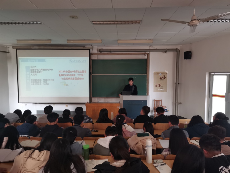 活动伊始,王国昊从社会实践“是什么、为什么、怎么做、该怎么办”四个方面进行了细致讲解。他讲到,社会实践活动主要是由参与形式、实践主题、实践形式等方面组成,活动开始前要提前做好准备,做好规划,不能盲目。此外,对于在实践过程中可能遇到的一些问题以及后续工作的处理,他都进行了详细的讲解。然后,他介绍了社会实践活动项目及宣传方式。活动项目主要包括“走访校友”“乡亲乡爱”“调研实习”“志愿农大”等基本活动;社会实践的宣传主要通过包创建微信公众号、微博,联系当地电视台、报社等媒介机构,村广播宣传栏等进行开展。王国昊结合自身经历并从实际出发,对在场的学生讲到了自己的经验,比如“教学相长”、“锻炼才干”、“满足好奇心”、“增加友谊”等。