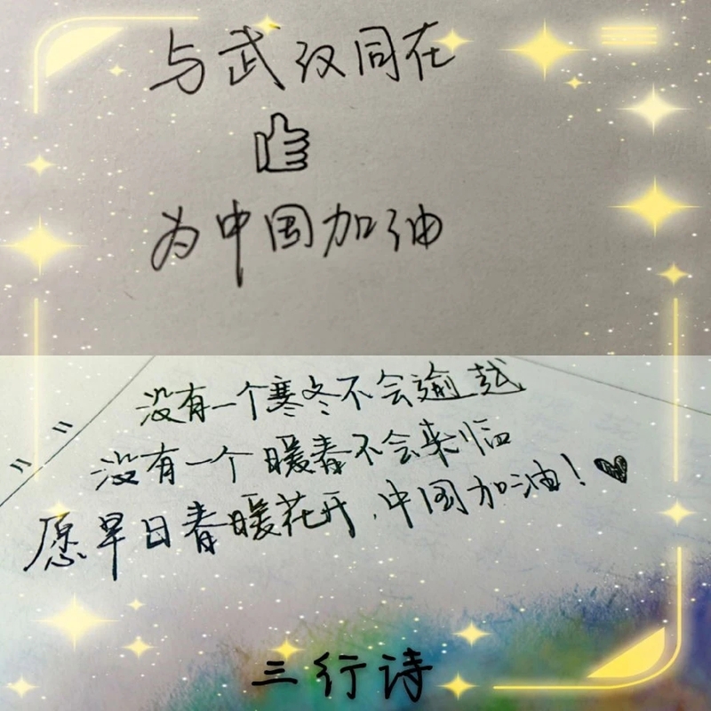 更有张金欣,梁茜等同学在自己家乡参与抗击疫情志愿服务工作,他们奔波在基层第一线,是平凡的劳动者,也是抗“疫”的战斗者,他们是我们应该学习的榜样。期间,我们还组织了“三行诗,我们来接力加油!”小活动,简单的白纸黑字,简短的两三句话,却表达出此时我们命运相连,我们不分彼此,我们虽在异乡,却心系广大奋斗前线,抗击疫情的战士!