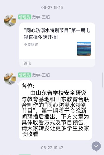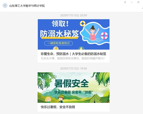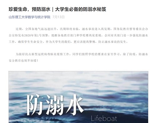 为了有效预防学生溺水事故,强化学生防溺水安全意识,提高学生自防自救能力,确保学生生命安全,暑假前夕,数学与统计学院组织全体学生及家长共同观看山东教育卫视《同心防溺水特别节目》,并以学院微信公众平台为载体积极宣传防溺水安全教育常识。