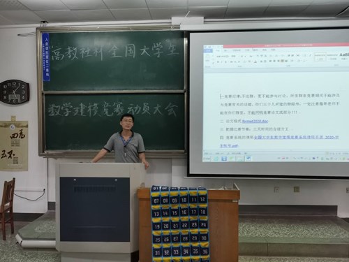 2020年9月10日下午五点,数学与统计学院在15号教学楼103教室举行了第29届“高教杯”全国大学生数学建模竞赛动员大会,数学与统计学院党总支副书记曹玉霞、全体数学建模指导老师和参赛学生参加了此次会议,会议由数学建模负责人丁树江担任主讲人。