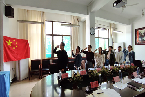 随后,在副院长王贵栋的带领下,新进教师面向国旗进行了入职宣誓。院领导为新进教师佩戴了校徽。