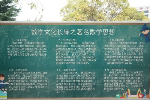 数学长廊包含数学文化长廊和数学趣味长廊两个栏目。数学文化长廊将各类数学文化展板放到指定位置,如数学的历史,著名数学思想,著名数学难题,著名数学人物等,以此来向大家展示数学学科的悠久历史和深厚文化,也让同学们对数学学科有更全面的了解。