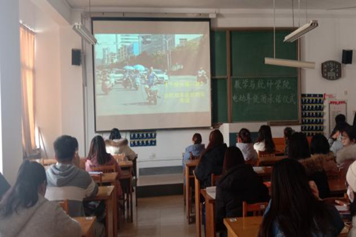 随后,加尼别克·阿布拉为参会学生播放了电动车警示教育片,教育警示片的内容分为违法行为篇、事故警示篇、如何行驶篇三个部分,指明了违法行为及其危害,并提到应该如何正确行使电动车,包括不随意变道、超标电动车不得载人、夜间行驶注意开启灯光等。