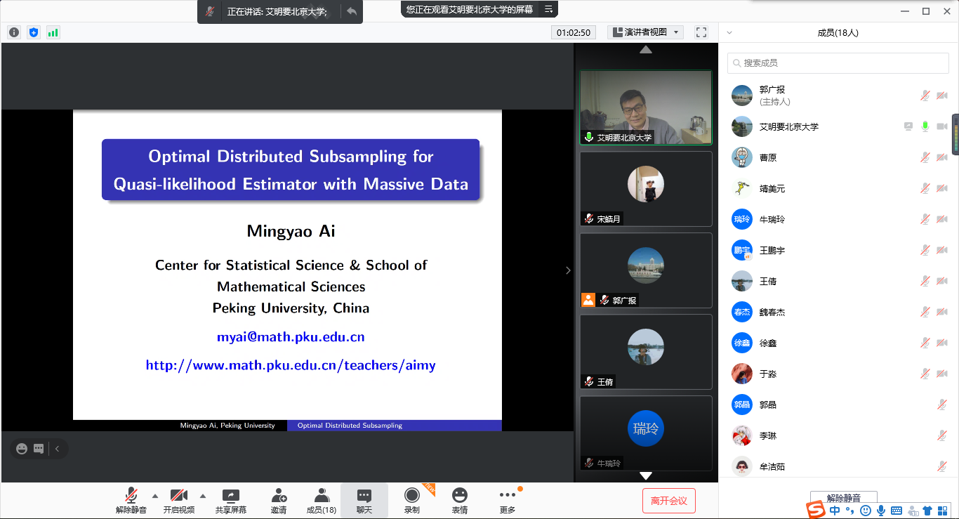 2020年12月10日下午,澳大利亚墨尔本大学钱国骐教授及北京大学艾明要教授应邀与数学与统计学院进行学术交流,在腾讯会议举行了两场主题为“统计与数据科学”的线上学术报告。报告由统计系副教授郭广报主持,统计系部分师生聆听了讲座,并与两位教授进行了交流。