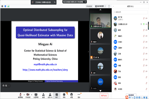 艾明要教授报告的题目是“Optimal distributed subsampling for quasi-likelihood estimator with massive data”。艾明要教授详细介绍了利用泊松子抽样计算不均匀的子抽样概率,重点阐述了在A-和L-最优准则下,在拟似然估计的背景下对最优泊松子抽样概率的推导及估计量的一致性和渐近正态性的建立。艾明要教授还介绍了处理存储在不同块或多个位置的完整数据的分布式子抽样框架,使在座的师生对该框架有了较直观和深入的了解。