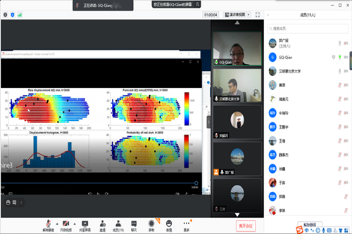 钱国骐教授报告的题目是“Modelling large-scale spatio-temporal data for forecasting by error-correction co-integration and dimension-reduction”。钱国骐教授详细介绍了一种用来模拟地质灾害高维非平稳时空数据中时空依赖动力学的新型随机时空协整(SSTC)框架,重点阐述了SSTC框架的推导及最大拟似然原理对最佳SSTC模型的估计。钱国骐教授还借助图像对塌方过程的数据变化及数据的降维过程进行了形象的演示,并为在座的师生提出了很多非常有价值的建议。