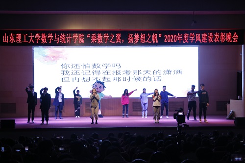 表彰晚会分为三个篇章:第一篇章为“忆古今,寻数学本真”,由歌曲《let it go》和《数学之路》组成,引导学生增强专业认同,勇敢面对困难,树立刻苦钻研、积极进取的意识;第二篇章为“展未来,亮青春底色”,由歌曲《追光者》、情景剧《加油,数院人》组成,通过巧妙的情节设计,引导学生展望大学生活,用梦想鞭策自我把握当下,努力提升综合素质;第三篇章为“看今朝,惜大好时光”,由歌曲串烧、相声《铃铛谱》和舞蹈《魅力新疆人》组成,丰富的节目形式展现了大学生多元的文化生活,鼓励学生珍惜韶华,健康、快乐成长。