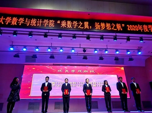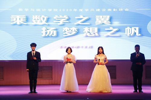 为进一步夯实学风建设成果,表彰成绩优异的集体和个人,发挥榜样示范引领作用,促进学生的成长与发展,12月17日晚,数学与统计学院在三号教学楼报告厅举行“乘数学之翼,扬梦想之帆”2020年度学风建设表彰晚会。学院党总支书记王玉冰、党总支副书记曹玉霞、副院长王贵栋,各系主任、2020级班级导师、辅导员老师、获奖学生及2020级全体学生参加晚会。