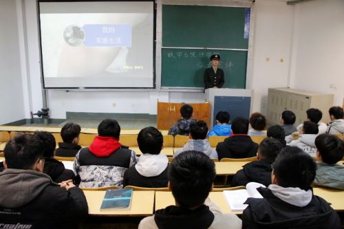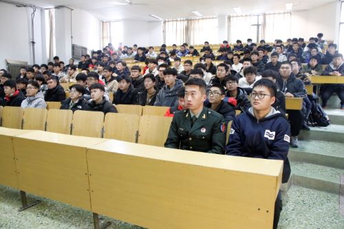 徐鸿飞与张丽君向20级新生介绍了大学生征兵的对象和条件、大学生征兵的时间以及报名的方法。按照大学生入伍征集条件标准,凡年龄在17-22周岁的男性高校新生、在校生和24周岁以下的男性毕业生;17-22周岁的女性高校新生、在校生、毕业生。只要身体达标、政治合格的便可以报名参军。