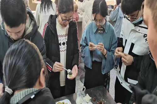 包饺子活动热热闹闹地开始了。大家分工合作,和面的和面、调馅的调馅、擀皮的擀皮、包饺子的包饺子,忙得不亦乐乎。同学们纷纷洗好手,捋起袖子,熟练地放馅料、捏饺子,十指翻飞之间,一只只精巧的饺子就诞生了。