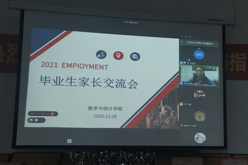 为做好我院2021届毕业生就业工作,提升同学们的就业积极性和就业能力,12月28日晚上,数学与统计学院召开2021届毕业生家长线上交流会,通过家校联动推动就业工作。毕业班辅导员张丽姣主持,各班学生骨干代表一起在15号教学楼414会议室参加了此次交流会。