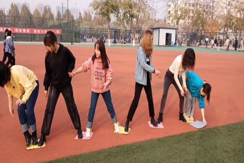 项目四——摸石头过河:每只队伍由六人组成,他们依次站在起跑线后的六块石头上,最后一名拿第七块石头,裁判发令后,由最后一名将手中的石块传递给第一名,第一名再将石块放置好后站在上面,其他成员依次前进,以此类推直到最后一名队员到达终点为止。这个游戏看似简单,实则考验了队员之间的协调能力,在比赛过程中,队员们一起讨论怎样才能以最快速度传递石块并且最快到达终点,在紧张激烈的比赛中,还要控制好自身的协调能力,稍有不慎便会踩空石块,增加时长,这种紧张刺激的游戏,吸引了众多同学报名参加。