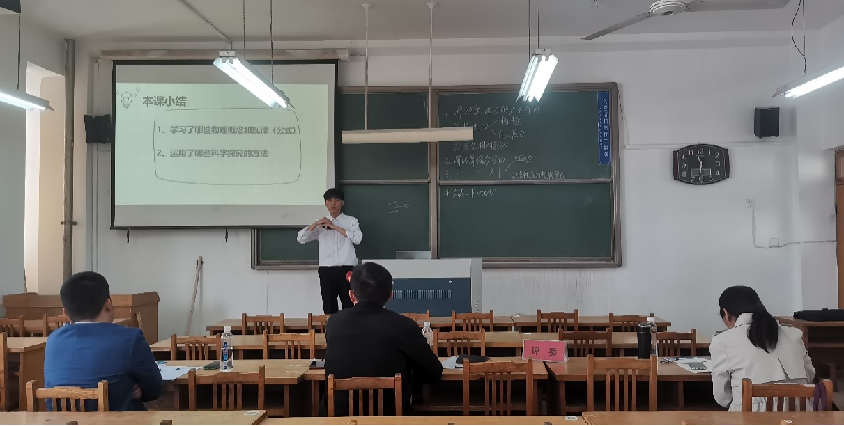 固定题目模拟上课环节,他们精神饱满、教态自然,运用多媒体课件和自制教具等教学工具作为辅助,突出了新课程的教学理念,展示了优秀的课堂教学技巧。在模拟课堂上充分展现了青年教师应有的的风采,从课件和讲课模式的准备上能感受到他们充分认识到了教师这一角色所应该秉持的态度和承担的责任,体现师范生所应该具备的专业知识和综合素养。