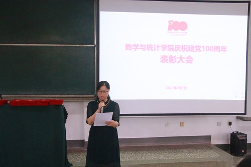 7月1日上午,数学与统计学院党委组织全体师生党员在15号教学楼103教室收听收看《习近平总书记在庆祝中国共产党成立100周年大会上重要讲话现场直播》之后,举行了庆祝建党100周年表彰大会暨师德专题教育动员会。学院党委副书记、院长李功胜宣读表彰决定,学院党委书记王玉冰作了师德专题教育动员讲话,会议由学院党委副书记曹玉霞主持。