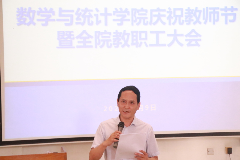 9月9日下午,数学与统计学院在15号教学楼103教室举行庆祝教师节暨新学期全院教职工大会,会议由学院党委书记王玉冰主持,院长李功胜、党委副书记曹玉霞、副院长孙俊涛以及全院教职工参加了会议。