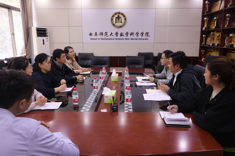 曲阜师范大学数学科学学院负责人及相关科室工作人员就党建工作、人才培养、学科建设、学生工作等方面取得的成效及先进经验进行了详实地介绍,双方围绕基层干部队伍建设、课程思政建设、博士点申报、“一流”专业建设、考研率提升等问题进行了深入交流,针对学院建设发展的重点、难点问题进行了充分讨论。此外,副院长孙俊涛、统计学系副主任郭广报一行到曲阜师范大学统计学院就统计学专业硕士的建设进行了学习交流。