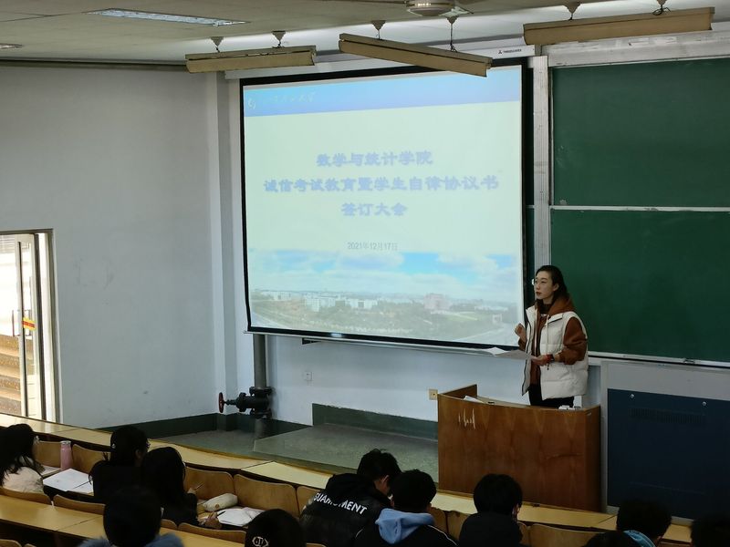 为进一步强化大学生的法纪观念和自律意识,扎实开展学风建设和考风考纪教育,共同营造“德业双修 学而不厌”的优良学风,数学与统计学院结合学校相关通知要求,组织2021级全体新生统一签订《山东理工大学教育管理与学生自律协议书》,以班级为单位签订《学风建设承诺书》和《诚信考试承诺书》。