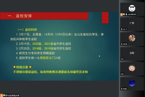 会后,学院全体辅导员分别组织召开线上主题班会,班会上,辅导员对每日健康信息采集等返校准备工作进行强调,进一步增强学生疫情防控的意识;说明返校流程和返校须知,进一步保障学生顺利返校,筑牢校园安全防线;讲清返校后的注意事项,进一步确保新学期开学工作有序进行。最后,辅导员耐心解答了学生提出的各种疑问。返校前,学院辅导员将通过山理app、山东省电子健康码、通信大数据绿色行程卡等,全面掌握返校学生的生活轨迹和健康情况,为返校工作打下坚实基础。