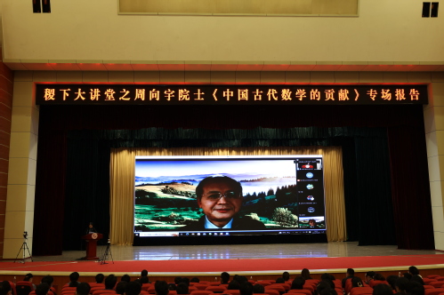 周向宇院士以“中国古代数学的贡献”为题作了精彩的数学科普报告。他从商高对勾股定理的完整证明,阿拉伯代数的思想源泉问题,中国古算与国学的联系、诸子百家核心人文思想与数学思想的融合,国学经典中的数学思想等四个方面,分享了自己学习与研究中国古代数学和国学的心得体会与研究成果,提炼出中国古代数学“言约旨远”的深意。结合易经中的二进位制的雏形思想、老子的三进位制思想、墨子的半分法中的区间套思想、愚公移山中的阿基米德原理等案例,周向宇院士从一个全新的角度对数学与国学、古代数学理论、中国传统文化中的人文精神与科学精神的融合等作了深入论述,从中国古代哲学中挖掘现代数学思想的萌芽,阐明了中国古代数学对现代数学的巨大贡献。