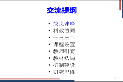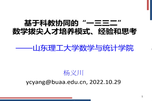 本次会议由王建锋主持,介绍了杨义川教授在教学和科研中的丰富成果和本次报告的主题。在本次报告上,杨义川教授从拔尖珠峰、科教协同、一三三二、课程设置、教师引育、教材选编、机制建设和学生研究思维培养八个方面,分享了北航-中科院华罗庚数学实验班的做法、经验和思考。