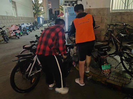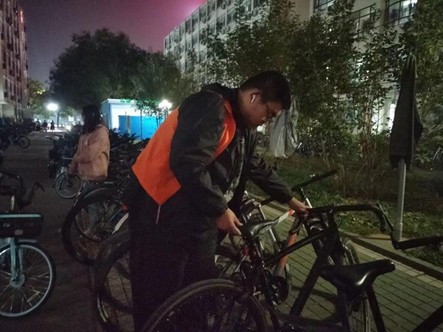 活动前,在1718宿分别张贴规范摆放车辆倡议书提倡大家按照要求摆放车辆。活动过程中,权益部志愿者对道路两侧乱停乱放、影响通行及道路交通安全、摆放不一致等不规范停放行为的车辆,按照入位、顺向、整齐的要求进行了规整摆放。