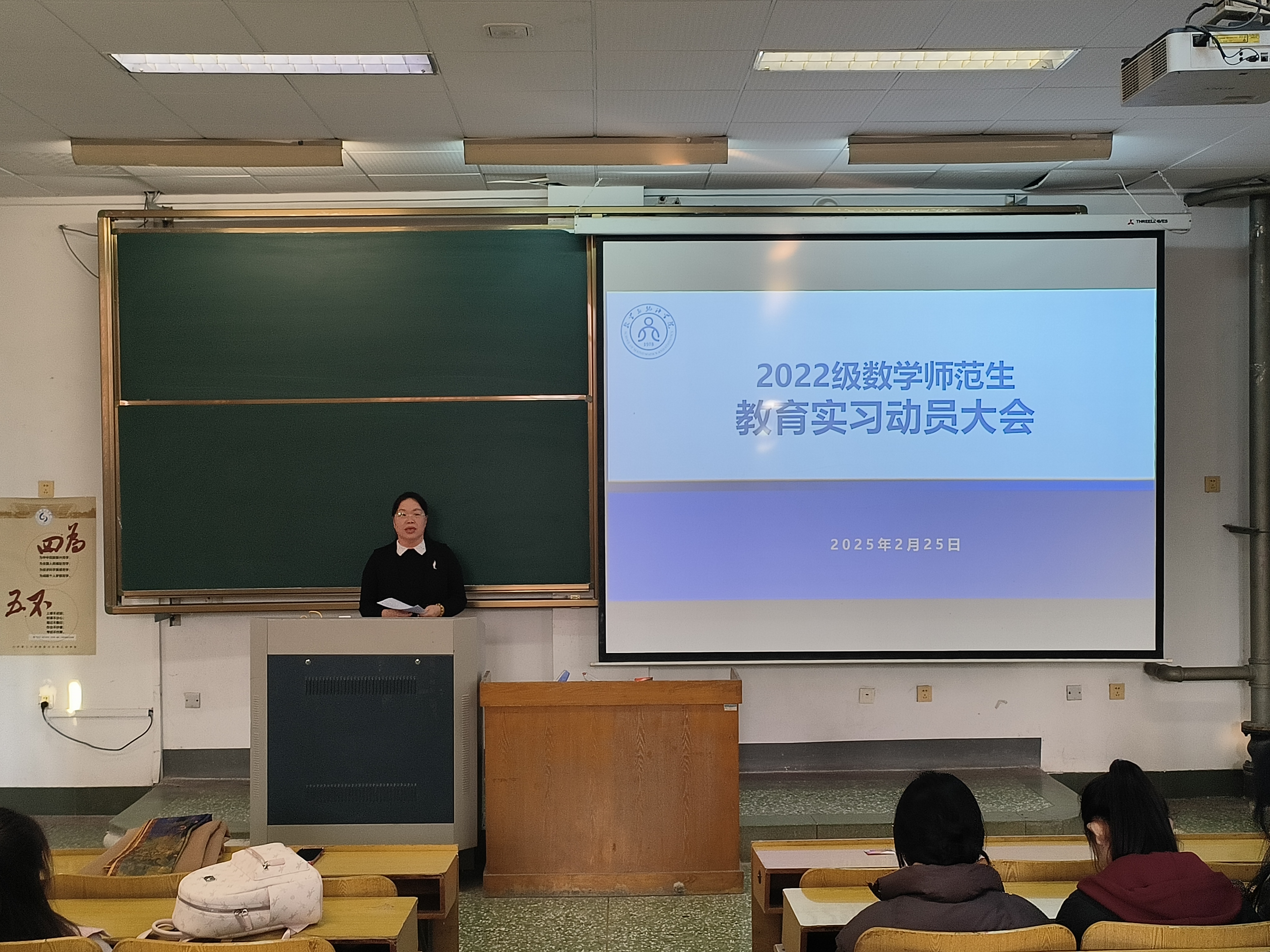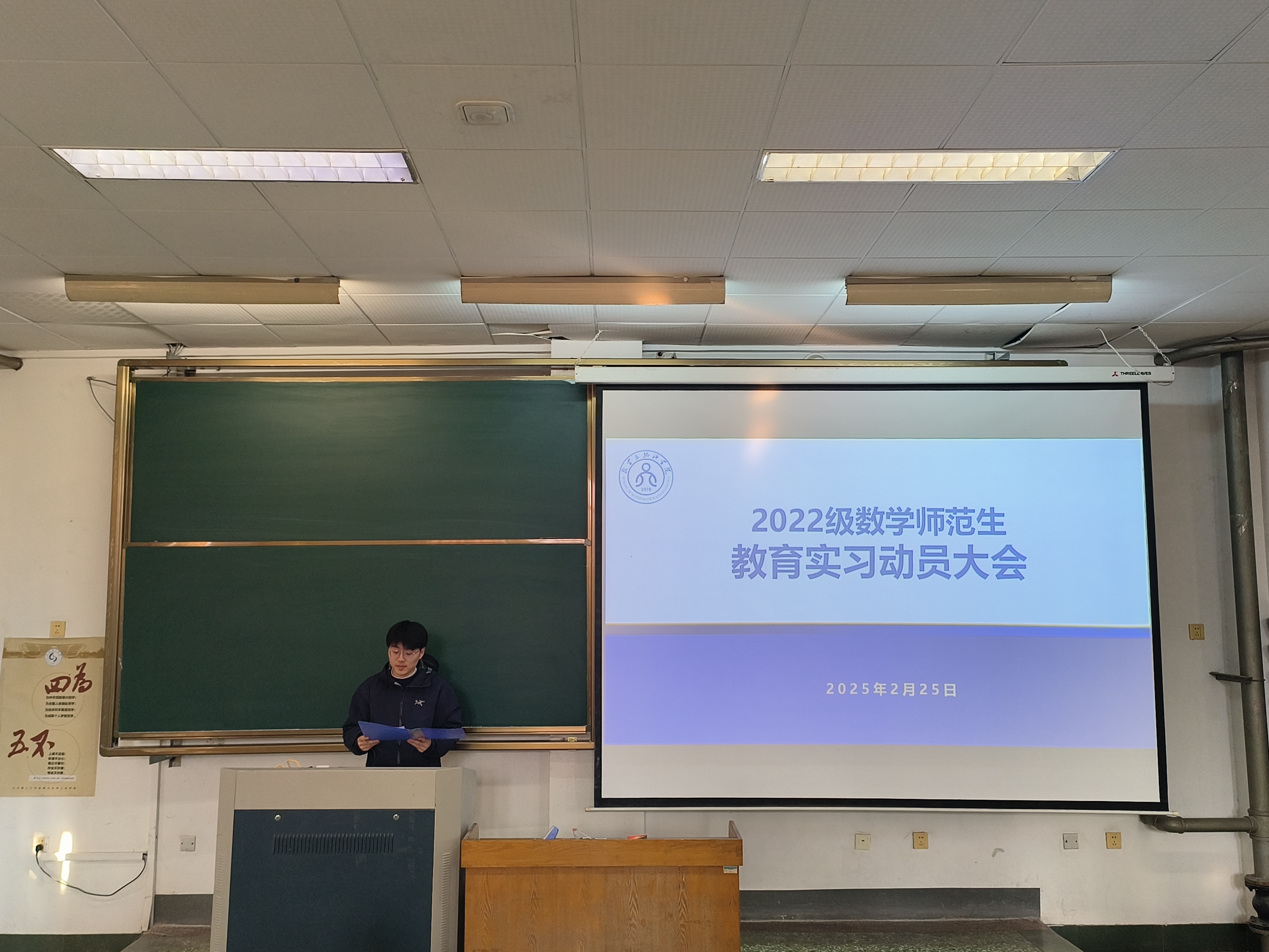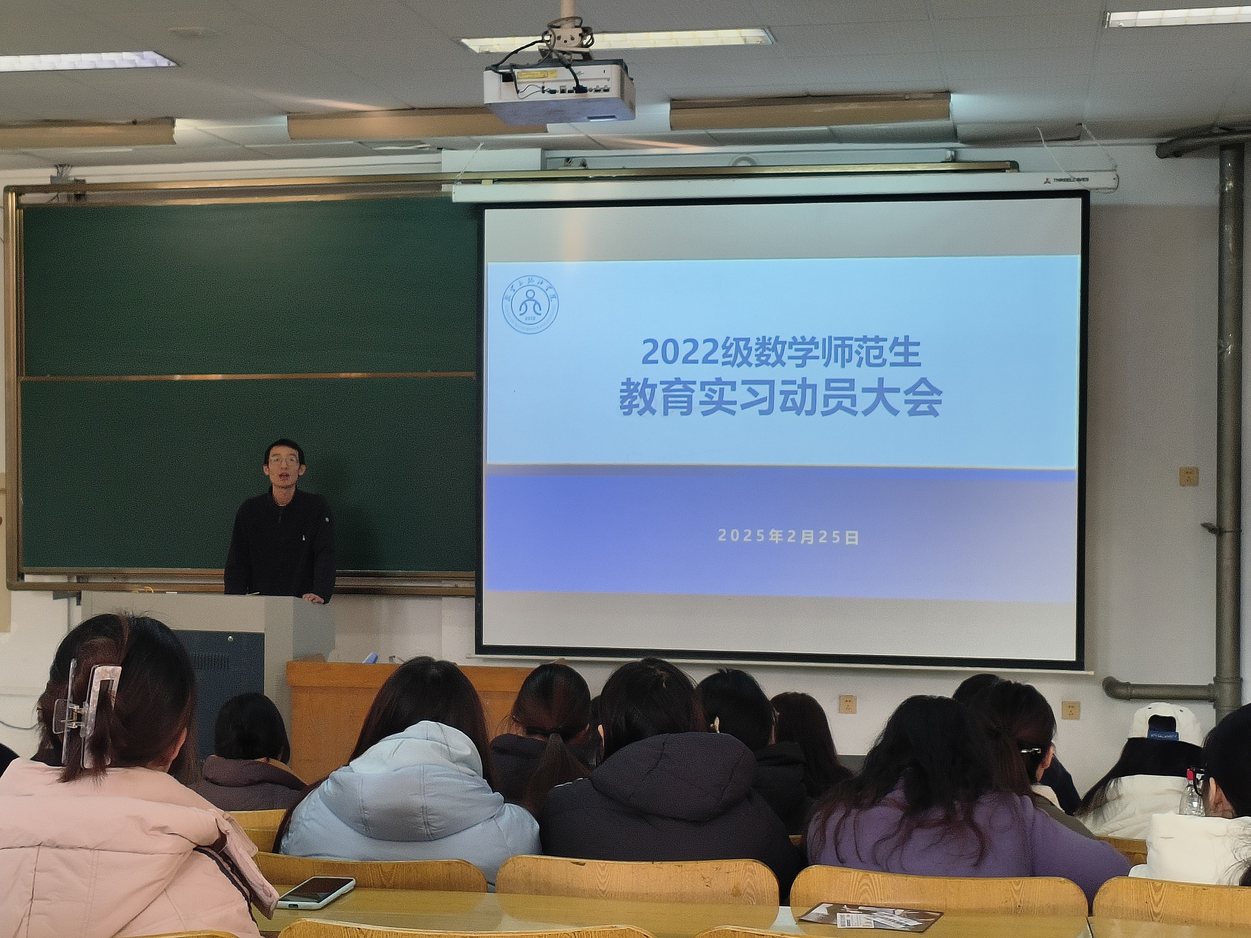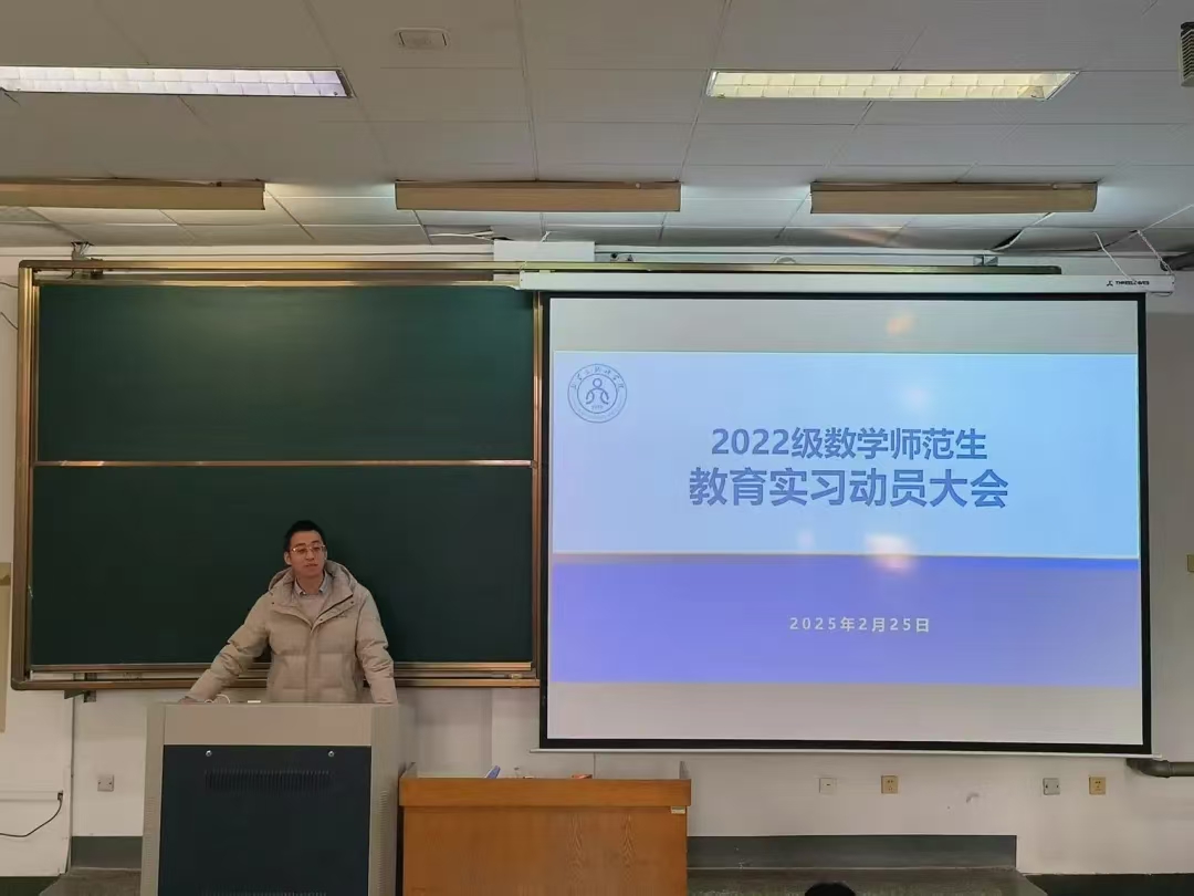 为鼓励学院2022级师范生们积极投身实习,在实践中提升教学能力,2月25日下午,数学与统计学院教育实习动员大会在15教103召开。此次动员大会由2022级辅导员刘曌阳主持,学院党委副书记曹玉霞、数学与应用数学系副主任马奎成以及全体2022级数学专业师范生参加。