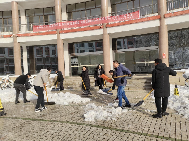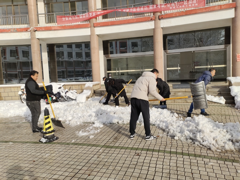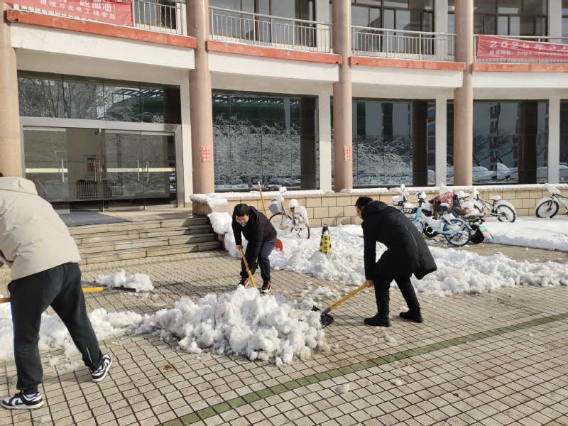 3月2日,淄博市迎来大范围强降雪,为保障师生安全出行和校园道路畅通,3月3日清晨,数学与统计学院领导班子成员、教师及学生党员、学生骨干组成扫雪队伍,清扫15号教学楼前及周边积雪。