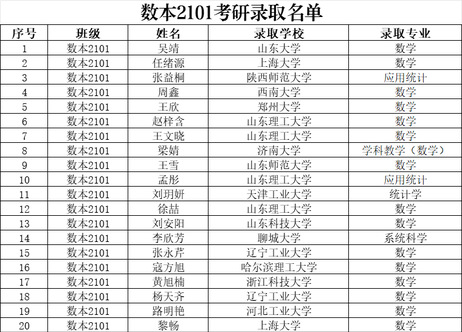 “不积跬步无以至千里,不积小流无以成江海。”数本2101班的44名追梦人,秉持着“数海研途,齐心筑梦”的理念,“研”途相伴,奋进共勉,以45.45%的考研上岸率脱颖而出,其中2人推免、18人考研上岸,包括山东大学、上海大学、西南大学等双一流高校。正如李大钊先生所言:“凡事都要脚踏实地去作,不驰于空想,不骛于虚声,而惟以求真的态度作踏实的工夫。以此态度求学,则真理可明,以此态度做事,则功业可就。”数本2101班的同学们正是秉持着这样的态度,在考研之路上稳步前行。