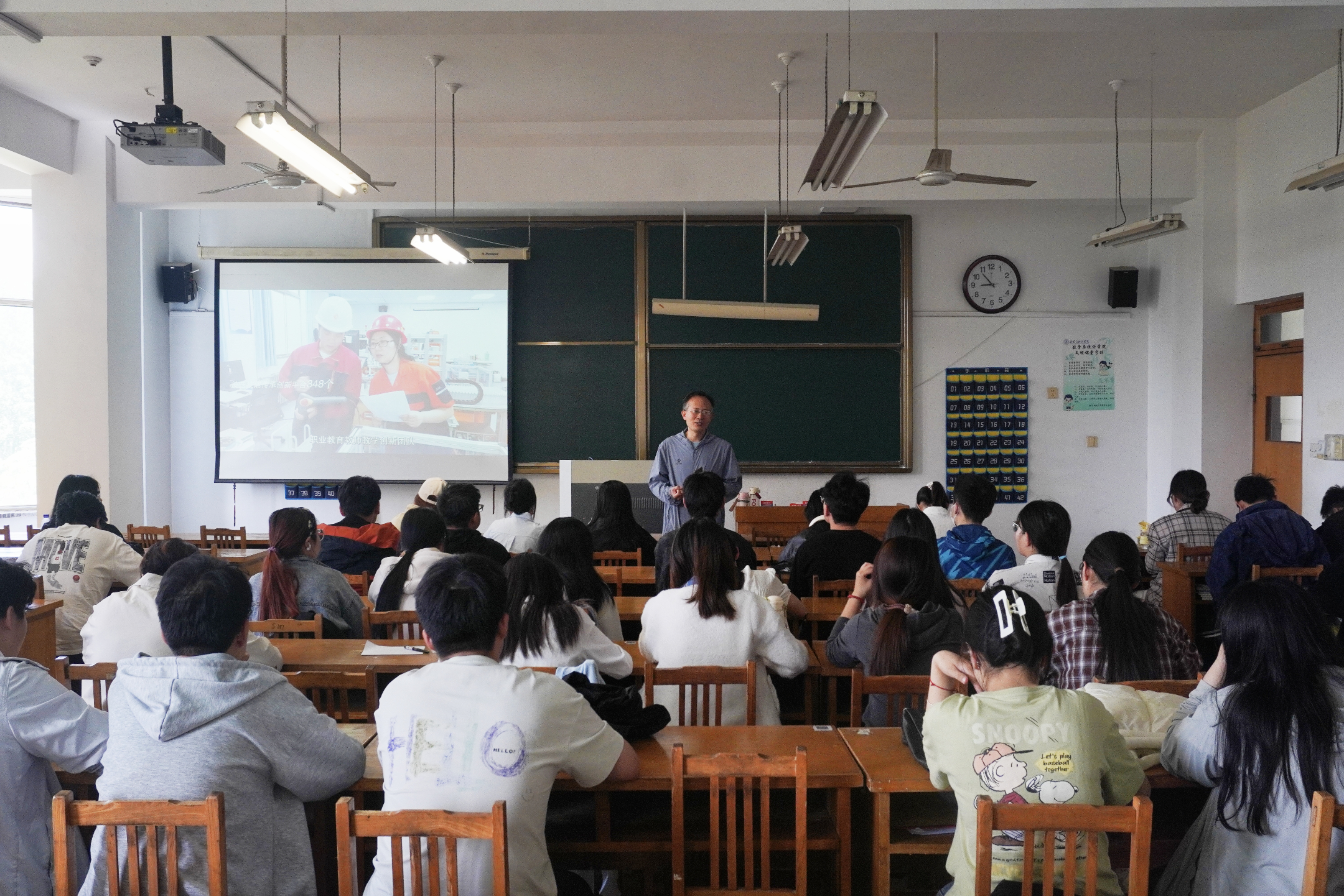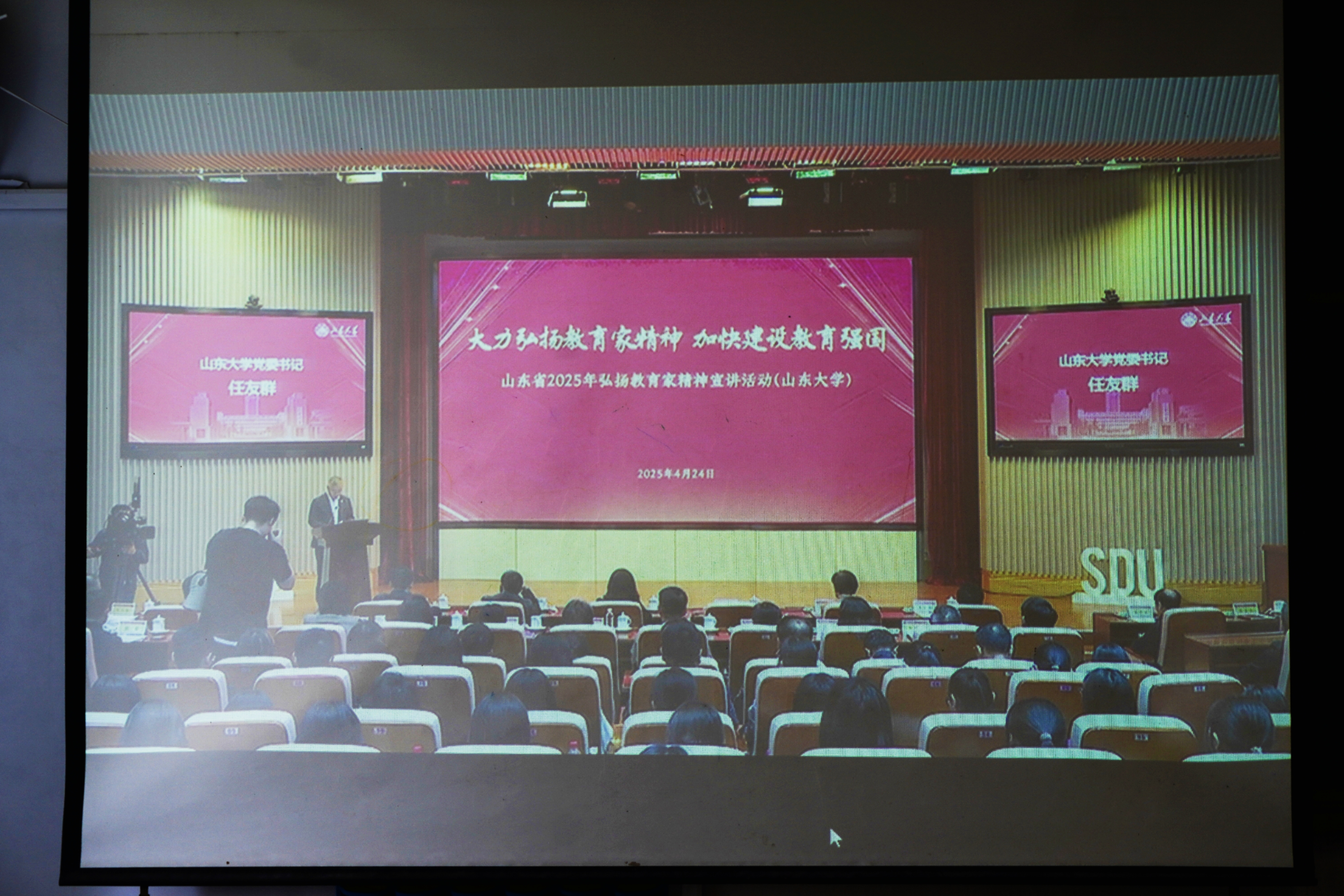 为弘扬教育家精神,以教育家精神铸魂强师,4月24日,山东省举办了2025年弘扬教育家精神宣讲活动,此次活动由山东省教育厅、山东大学联合举办,中国教育电视台、山东教育电视台协办,宣讲采取线上线下、同步直播方式进行。数学与统计学院积极响应山东省教育厅的号召,组织部分教师和数学与应用数学(师范类)专业学生在15号教学楼431教室观看宣讲直播。
