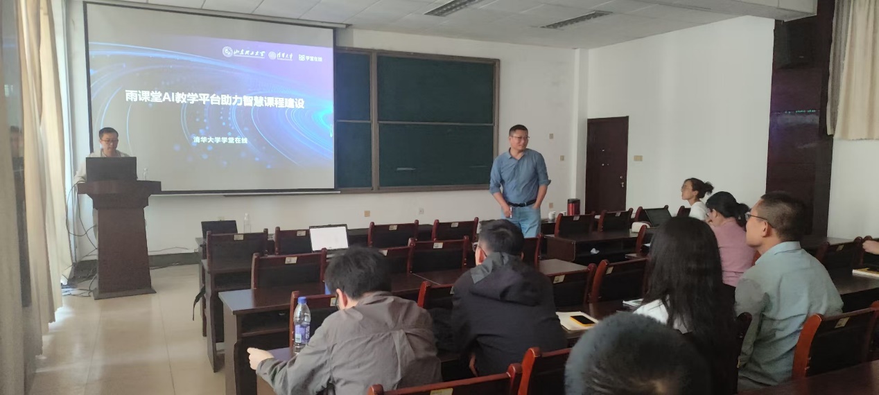 为推进我院智慧教学和AI示范课建设,4月28日下午在15号教学楼430报告厅,学院邀请学堂在线负责人做了《基于雨课堂平台的AI课程建设工作坊》培训活动。报告会由学院副院长徐夫义主持,学堂在线高级讲师许腾主讲。