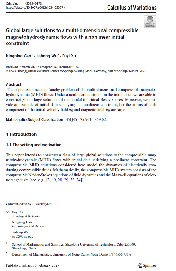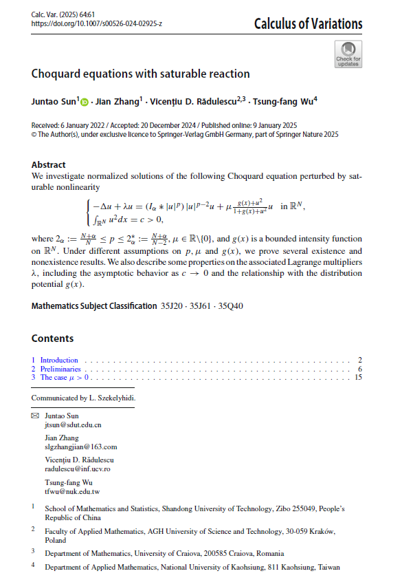 近日,我院微分方程与动力系统团队在偏微分方程理论研究方面取得新进展。孙俊涛教授与研究生张剑合作的论文“Choquard equations with saturable reaction”,徐夫义教授与研究生高宁宁合作的论文“Global large solutions to a multi-dimensional compressible magnetohydrodynamic flows with a nonlinear initial constraint”,相继发表在国际著名数学期刊《Calculus of Variations and Partial Differential Equations》,山东理工大学为第一完成单位。