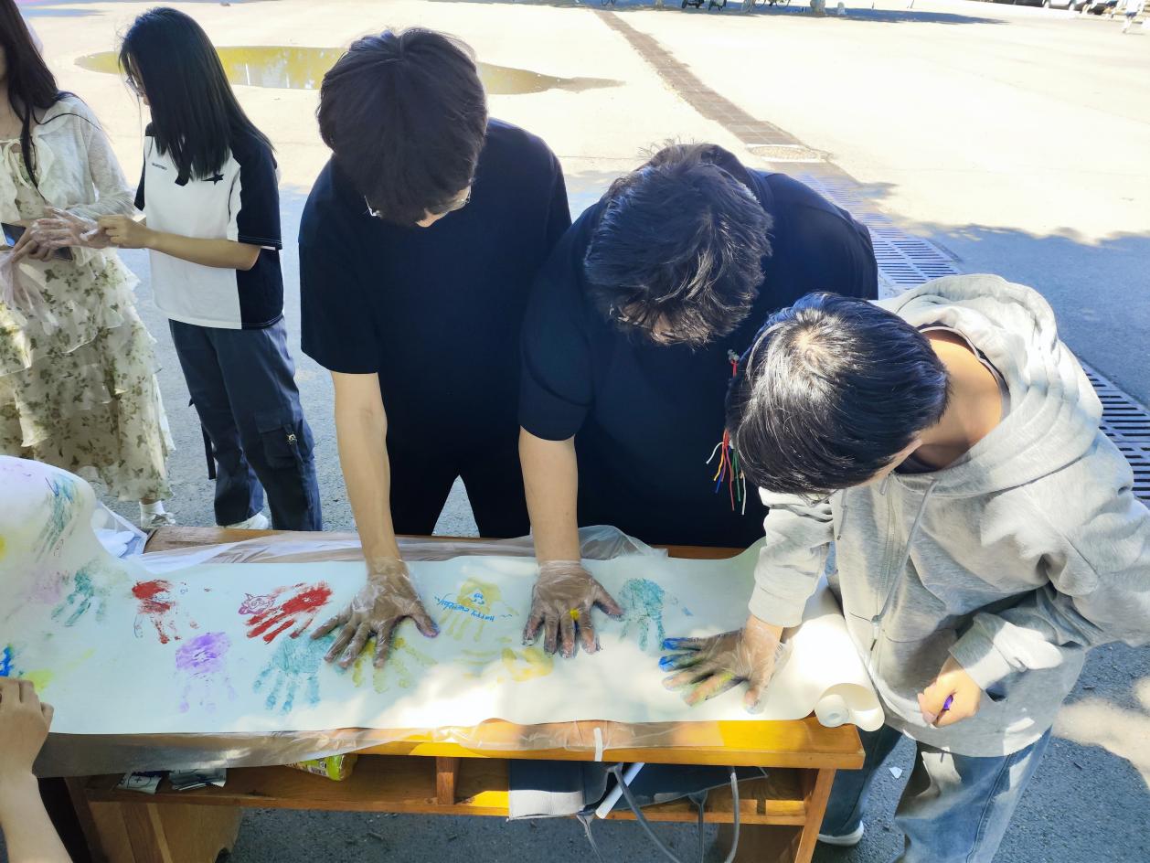 本活动环节由志愿者们提前准备好一块3-5米长的油画布以及湿巾、一次性手套和可水洗染料,参赛选手戴手套染色后,与他人击掌互动,按压手掌后在油画布上留下手印,并用马克笔书写内心话语。色彩调配、击掌互动缓解压力,书写环节助力自我认知与心理成长,活动蕴含着丰富的心理教育功能和价值。
