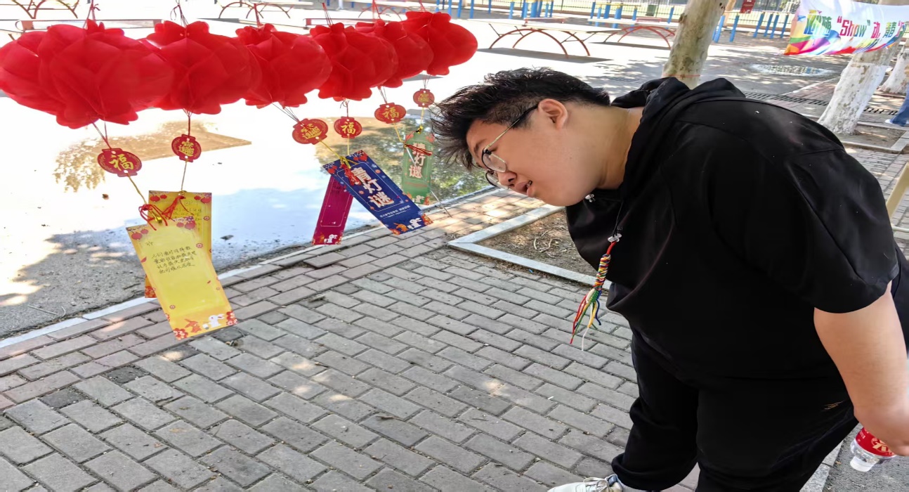 本活动现场灯笼高挂,灯笼悬挂的卡片上写有灯谜题目,内容涵盖了心理健康及学校相关知识。