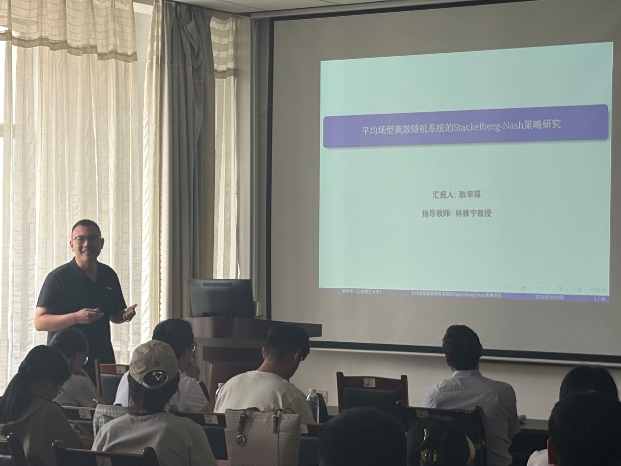 校级报告会主讲人数学与统计学院硕士研究生章融、李雷、耿率琛分别作了题为“带有负位势的Schrodinger-Bopp-Podolsky系统正规化解”、“Seidel matrices, Dilworth number and an eigenvalue-free interval for cographs”、“平均场型离散随机系统的Stackelberg-Nash策略研究”的报告。