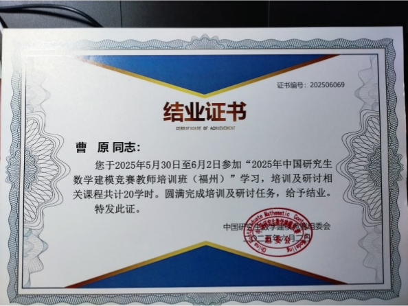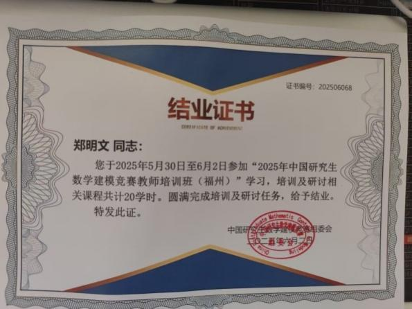 近日,由中国研究生数学建模竞赛组织委员会主办、福州大学承办的“2025年中国研究生数学建模竞赛培训教师学术交流会”在福州大学顺利召开。我校数学与统计学院教师郑明文和曹原作为代表参会,与来自全国100多个研究生培养单位的近180位专家学者共同交流研讨,进一步提升我校数学建模教学与竞赛指导能力,助力研究生创新人才培养。