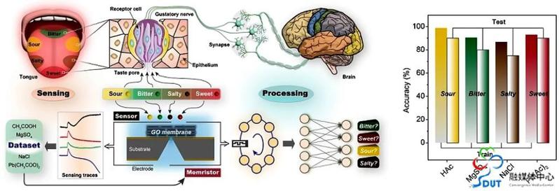 近日,我校数学与统计学院青年教师乔瑜与国家纳米科学中心鄢勇课题组合作在神经形态智能味觉器件方面取得新进展,模拟的人工味觉系统可以实现酸、苦、咸、甜四种基本味型以及咖啡、可乐等复杂风味的准确识别。该研究相关成果以Confinement of ions within graphene oxide membranes enables neuromorphic artificial gustation为题发表在国际顶级期刊《美国国家科学院院刊》,《Nature》杂志以“Sweet or sour? AI-powered device achieves human-like sense of taste”为题对此作了专题报道。