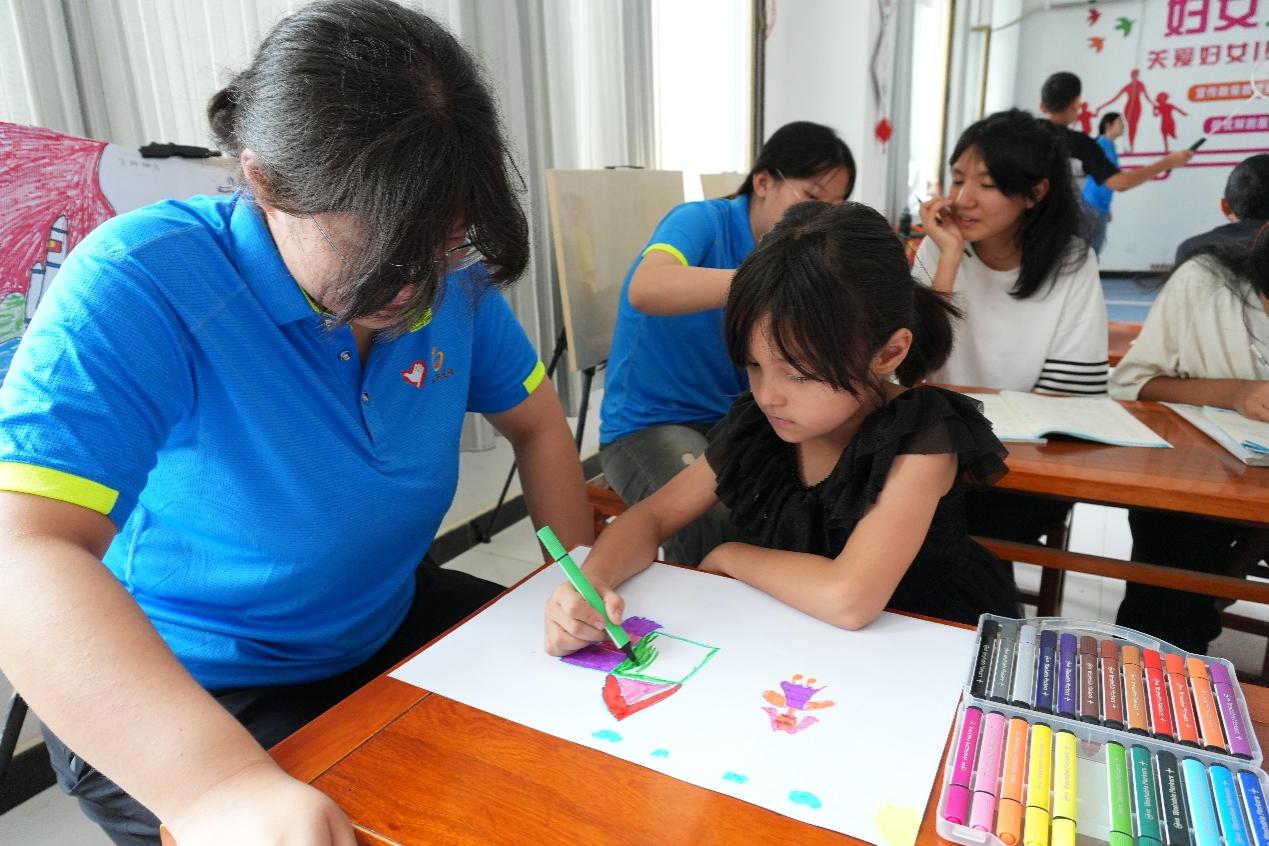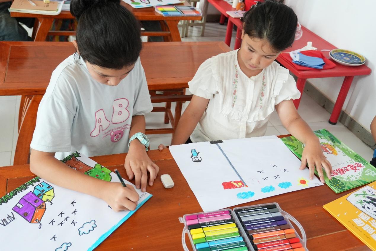 绘画环节中,“红领巾小课堂”的孩子们手执画笔,纷纷画出自己眼中的世界。有的孩子一笔一画认真描绘“天安门”,稚拙的笔触里藏着最单纯的爱国情怀;有的孩子用画笔勾勒自己的家,画纸上小小的房子和家人,是孩子们单纯世界中最美好的地方;还有的孩子发挥天马行空的想象,描绘了自己眼中美好奇幻的世界。绘画给了孩子们一份表达自我的机会,在轮廓的勾勒与色彩的涂抹中,孩子们的想象力与好奇心也得到了提升。
