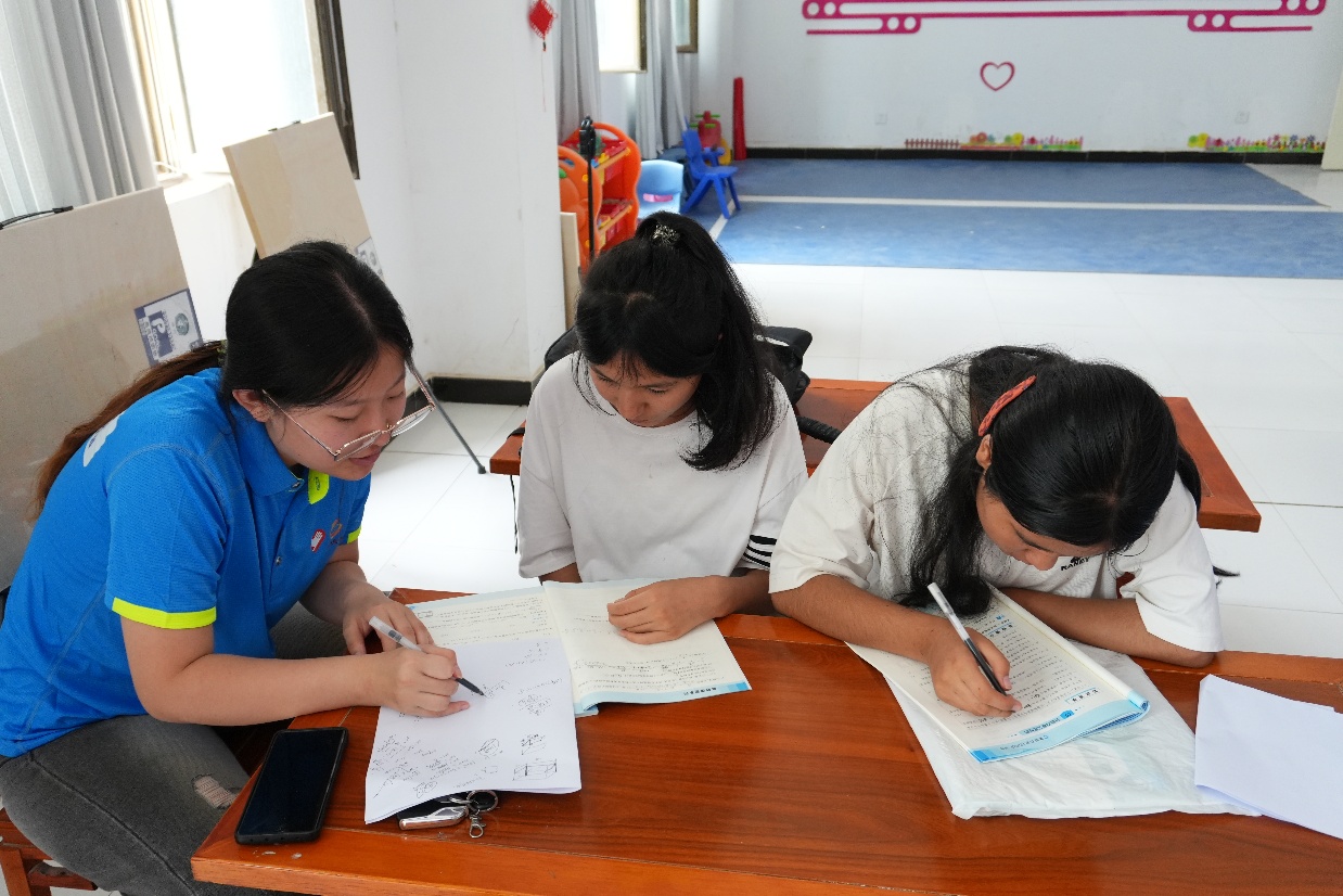 实践团成员在课堂上开展了答疑活动,针对孩子们进行了“一对一辅导”,耐心为他们解答疑惑。实践团成员表示,“学习要知其然,更要知其所以然。”在讲解中将每道题目背后的知识点拆分开来,回归课本,并针对每一位孩子知识薄弱点进行系统讲解,传授相关题型解题技巧。孩子们认真聆听,积极配合,不懂就问,让自己在课堂中真的有所收获。