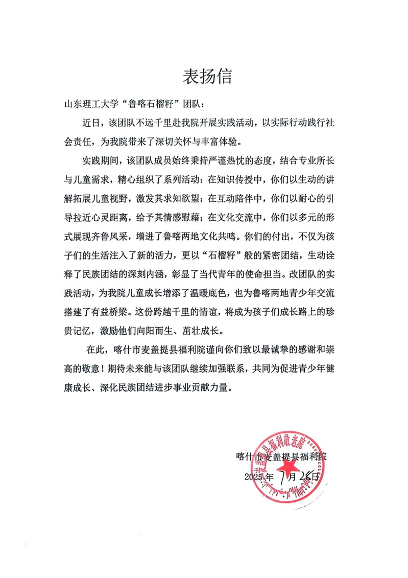 为铸牢中华民族共同体意识,传递跨越地域的关怀与温暖,7月28日,鲁喀石榴籽社会实践团走进麦盖提县社会福利园区,在实地调研中感受各族群众交融共生的生活图景,以青春力量续写民族团结新篇章。