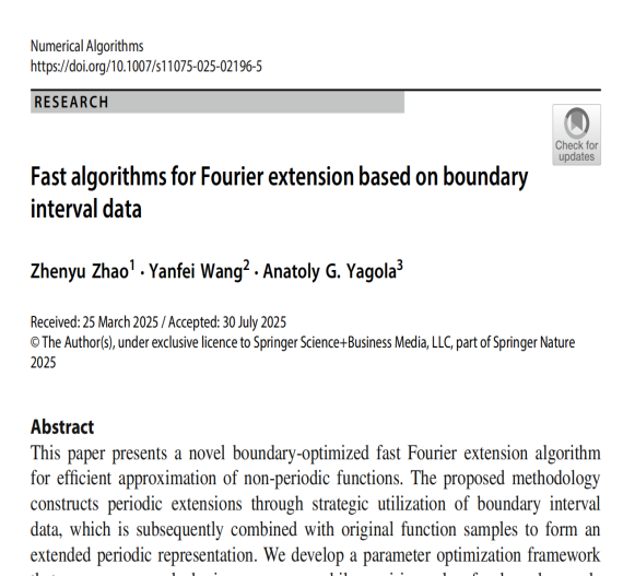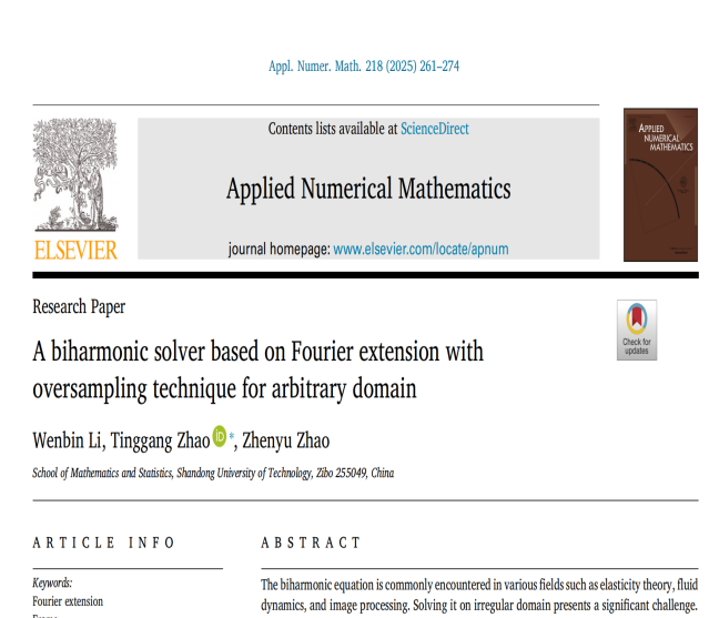近日,我院科学计算与反问题团队在傅里叶延拓算法研究方面取得新进展。研究成果“A biharmonic solver based on Fourier extension with oversampling technique for arbitrary domain”发表在《Applied Numerical Mathematics》上,“Fast algorithms for Fourier extension based on boundary interval data”发表在《Numerical Algorithms》上,山东理工大学均为第一完成单位。