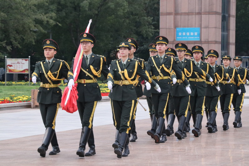 仪式始伊,伴随整齐有力的脚步声,升旗手与护旗手迈着坚定的步伐入场。他们身姿挺拔、神情肃穆,稳稳将五星红旗护送至旗杆下。