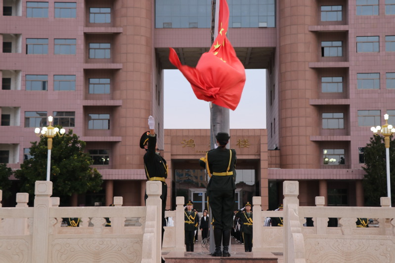 当雄壮的《义勇军进行曲》奏响时,五星红旗迎着晨曦缓缓升起。全体师生面向国旗肃立,行注目礼,高声齐唱国歌。