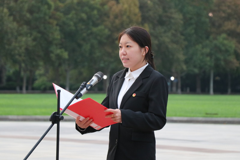 学生会主席吕良宇带领大家重温入团誓词。在吕良宇的带领下,全体团员举起右拳,面向国旗庄严宣誓。铿锵有力的誓词响彻广场,不仅是团员们对初心的回望,更展现了新时代青年传承红色基因、勇担时代使命的坚定决心。