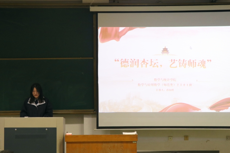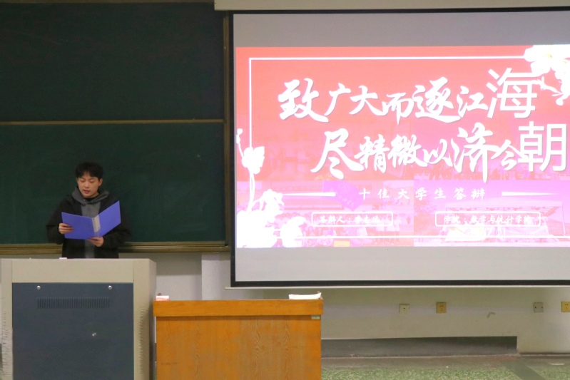 会议伊始,主持人明确答辩流程,并由抽签决定候选人发言顺序。随后,十佳大学生候选人荣梦、李志远依次登台以PPT形式展开答辩,分别从学业成绩、科研竞赛、任职经历与社会实践等方面介绍,展现了数院学子“严谨务实、知行合一”的专业特质;十佳班集体候选数教2301班、统计2201班与信科2201班班级代表依次上台结合自身与班级特色展开陈述,聚焦思想建设、学风营造、集体凝聚力等方面汇报成果。